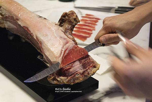 每只伊比利豬火腿都需要五年的時間,除了需要兩年放養還要三年自然風乾,而豬的腳上都有特別的黑標,每盤伊比利火腿都是現點現切,若是剛切完還不能馬上切下一道,需等時間才能繼續切。