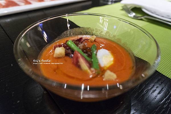 還以為是一般的冷湯,可能對於西班牙料理涉略不大。Salmorejo其實是西班牙料理中的三大冷湯之一( 另外兩種為gazpacho及ajo blanco ),比起 gazpacho 更濃郁且滑順。使用櫻桃、番茄、甜醋、西班牙橄欖油打成冷湯,湯上面搭配蘆筍、蛋、西班牙火腿及鮭魚卵增加不同口感,喝起來清爽且開胃。(但確實跟台灣人平常吃的料理味道稍有不同)