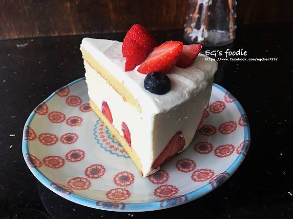 每個甜點都讓人想點,最後決定來個季節限定甜點:草莓蛋糕,看了以下的圖讓我不經想到,一個美麗蛋糕配上一個美麗盤子是非常重要的事XD,也太美太好拍了吧,什麼角度都美,這個蛋糕不會很甜很膩,反而草莓真材實料的多,推薦給愛草莓的草莓控來吃,奶油也不會很膩(雖然我怕胖)