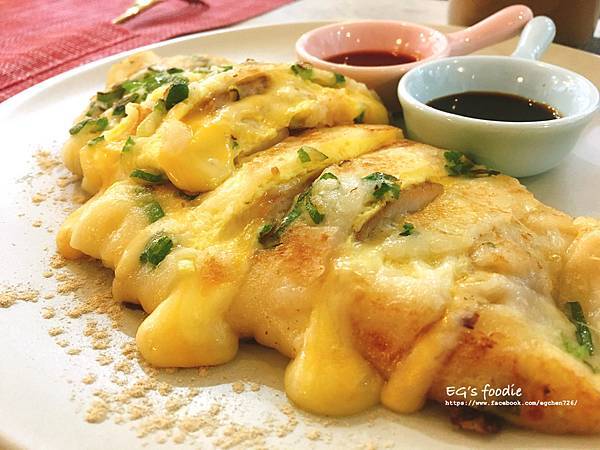 不得不說看起來不是非常美,但是真的很好吃!好吃到我們又多加點一份蛋餅。粉嫩口感再加上醬油跟辣醬~真的可以自己吃掉一大份,如果沒有很餓有想來一份可以點一般蛋餅或是有加起司的。
