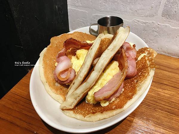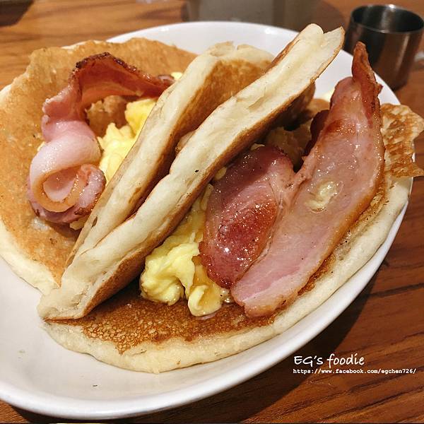 培根、炒蛋夾在鬆餅裡,在大膽淋上楓糖,這種甜甜又鹹鹹的味道,讓我想到日本麥當勞的鬆餅堡!