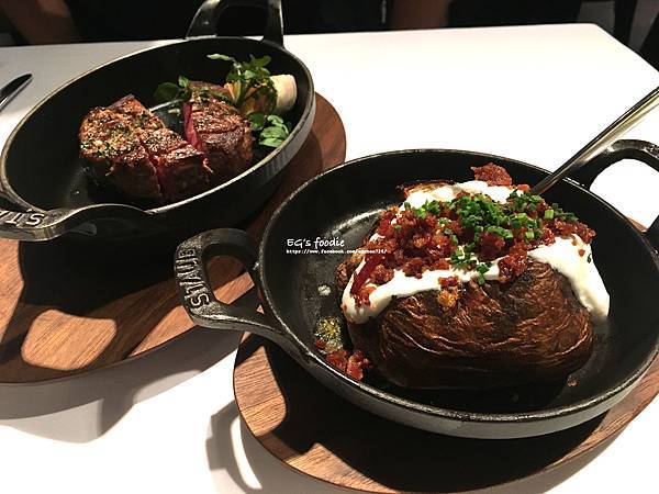 配菜則選擇馬鈴薯以及大蘆筍,這個我覺得大賴選的烤馬鈴薯比較好吃,但建議兩個人來吃不要都選馬鈴薯,你會太膩喔!馬鈴薯上面會加上類似酸奶的醬以及碎培根讓整體風味不會過於單調,再撒上青蔥(應該是吧..)讓美觀大幅提升,也增加食慾