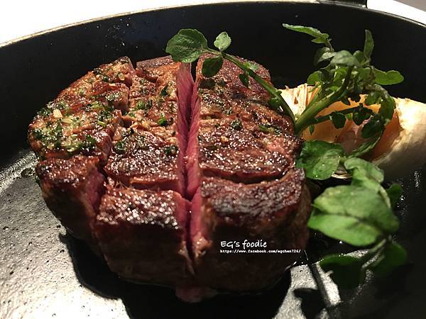 主餐上桌,原本是要點美國頂級老饕牛排,但店員推薦點選日本A4紐約客牛排,肉質較為細嫩,很推薦嚐嚐看,我們就順勢點了這道!點餐時還會詢問要厚切還是薄切,這是厚切喔(比較有嚼勁….) 肉質確實細膩有佳。但說我比較喜歡哪個,我可能會選下面那道。