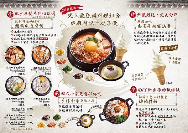 這家主打「韓式豆腐煲」和「鐵鍋拌飯」有七種豆腐鍋可以選擇,還可以選辣或不辣喔!(已更換菜單,二訪沒拍到)