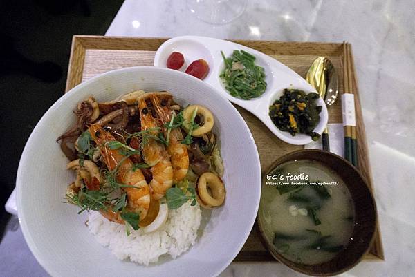 草蝦和澎湖小捲再以塔香辣醬熱炒,擠上金桔汁吃起來酸帶辣,飯量偏少,但海鮮量超多,還有三道小菜以及湯。